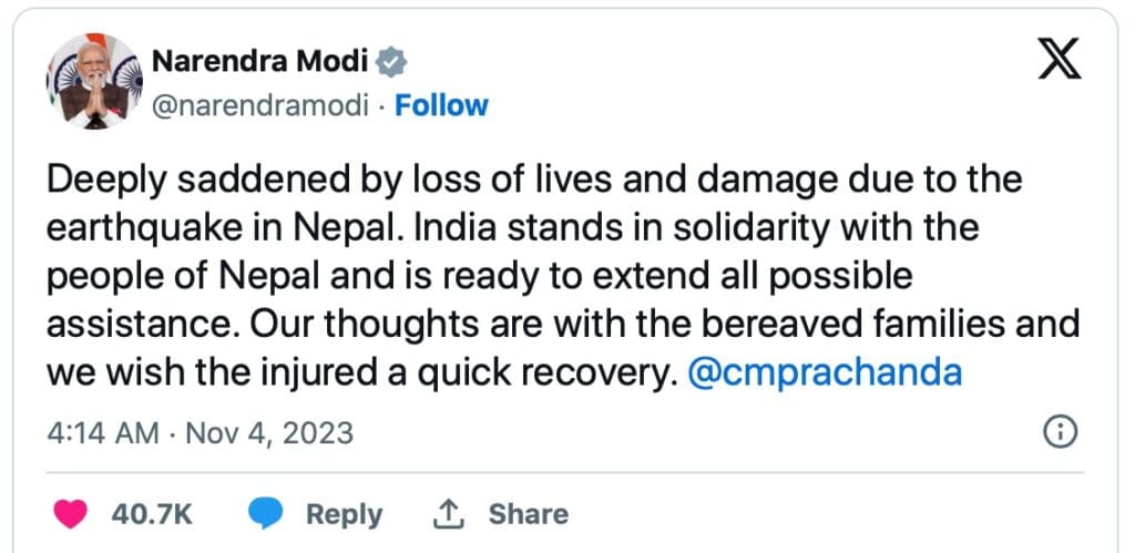 Por su parte, el gobierno de la India vecina ha ofrecido su ayuda en las labores de rescate. Así pues, el primer ministro indio, Narendra Modi, expresó su profunda tristeza por las vidas perdidas y los daños ocasionados por el terremoto a través de sus redes sociales