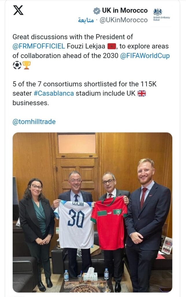 La embajada compartió en su página de la red social «X» una imagen que muestra a Fouzi Lekjaa, presidente de la Federación Real Marroquí de Fútbol (FRMF), junto al embajador británico en Marruecos, Simon Martin, y algunos empleados de la embajada, acompañada por el comentario: «Discusiones excelentes con Fouzi Lekjaa para explorar áreas de cooperación antes de la Copa Mundial 2030».
