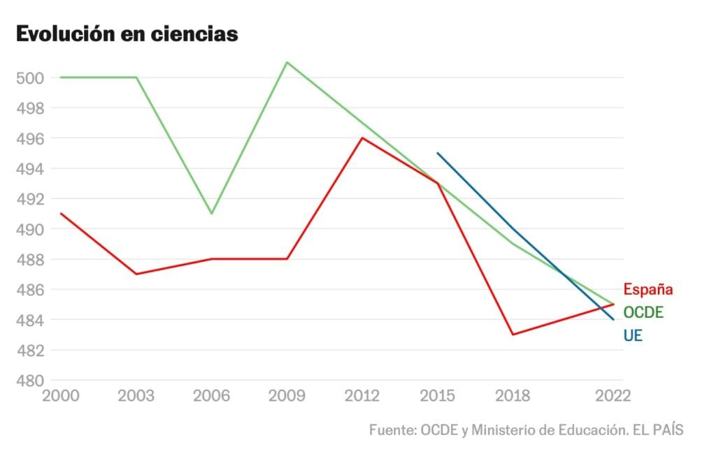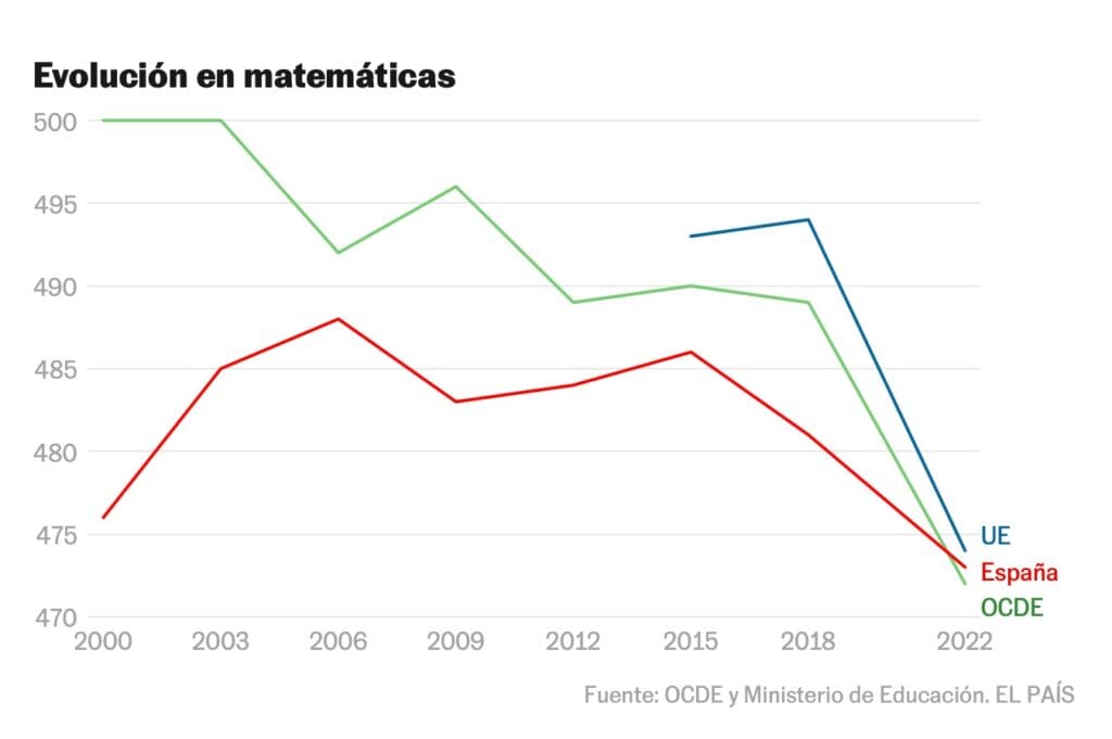 España registra sus peores resultados en la octava edición del informe PISA, la prueba global más importante en el ámbito educativo, desde que comenzó a realizarse en el año 2000. Según este informe, los estudiantes españoles del último curso de la ESO bajaron 8 puntos en matemáticas (473 puntos) y tres en comprensión lectora (474 puntos), al mismo tiempo que aumentaron dos puntos en ciencias, quedándose en 485 puntos.