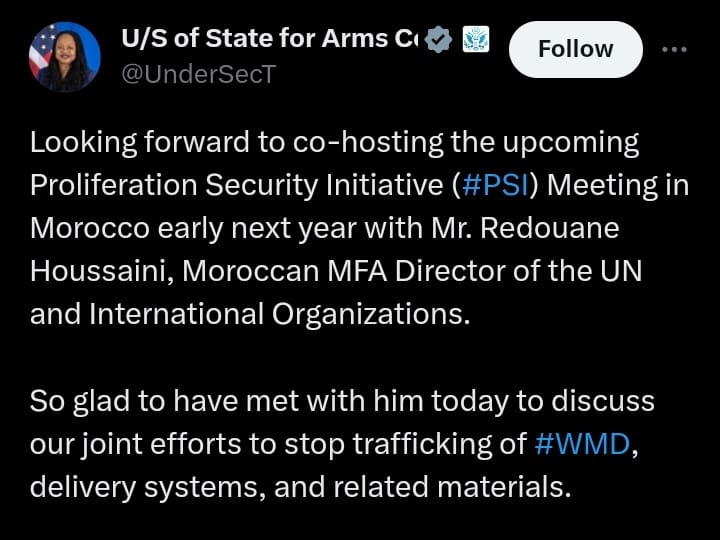 A principios del próximo año, Marruecos y los Estados Unidos celebrarán una reunión de la Iniciativa de Seguridad Global para Contrarrestar la Proliferación de Armas de Destrucción Masiva (PSI), un mecanismo internacional para el intercambio de información sobre la proliferación de armas nucleares.