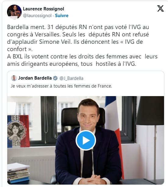 Diversas figuras públicas y activistas han desmentido los puntos defendidos por Bardella, señalando la falta de acciones concretas del RN en favor de los derechos de las mujeres. Según un reporte de la ONG Avaaz, los votos de los eurodiputados del RN han mostrado una actitud hostil o de abstención en medidas progresistas para los derechos de las mujeres, incluyendo la oposición a la reducción de la brecha salarial y el acceso al aborto seguro y legal.