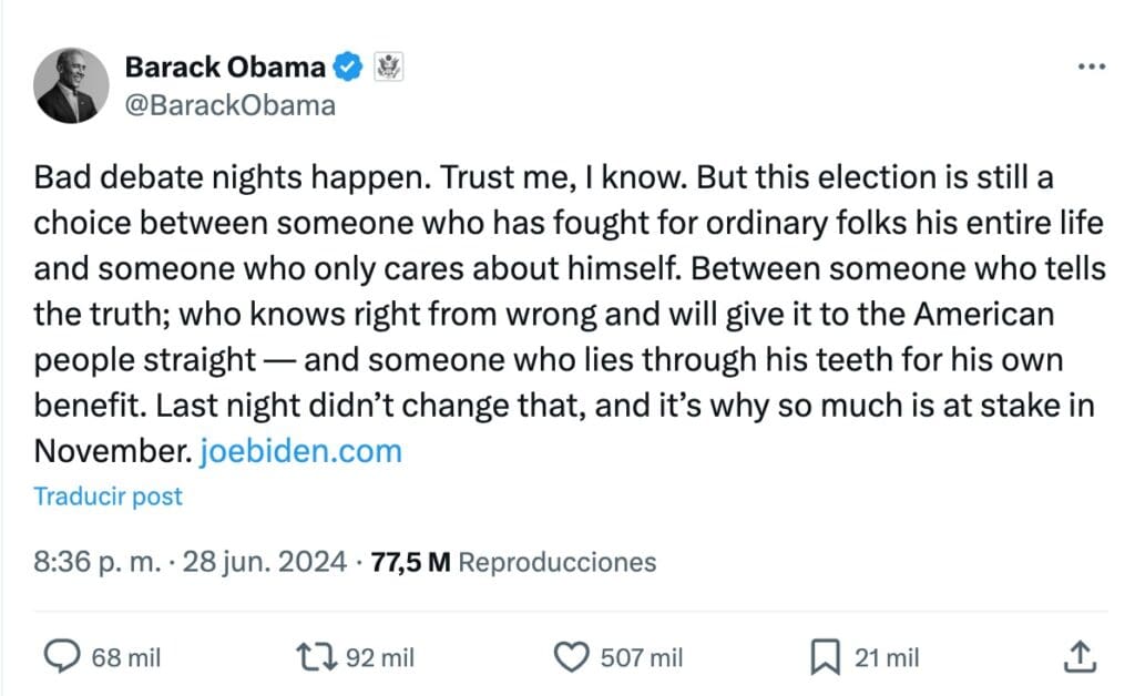 A este respecto, Obama destacó la diferencia entre Biden y su oponente (Trump), afirmando lo siguiente en su cuenta de la red social X, anteriormente Twitter: