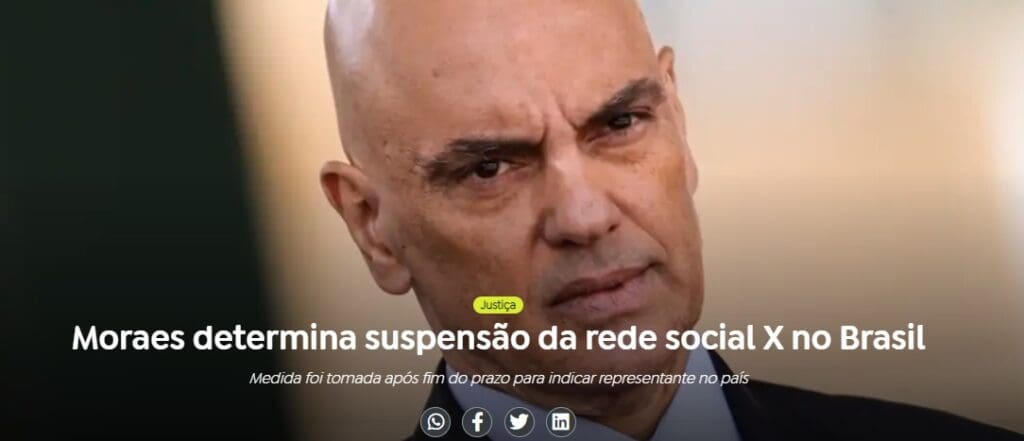 El ministro Alexandre de Moraes, del Supremo Tribunal Federal (STF) de Brasil, ordenó la suspensión de la red social X (anteriormente conocida como Twitter) en todo el país. Esta decisión -según la Agência Brasil- fue tomada después de que el dueño de la plataforma, Elon Musk, no cumpliera con la orden de nombrar un representante legal en Brasil, a pesar de haber recibido un plazo de 24 horas para hacerlo. La Agencia Nacional de Telecomunicaciones (Anatel) tiene 24 horas para ejecutar la suspensión y notificar a las operadoras de telefonía, que también deberán bloquear el uso de VPNs por parte de usuarios que intenten eludir la medida.
